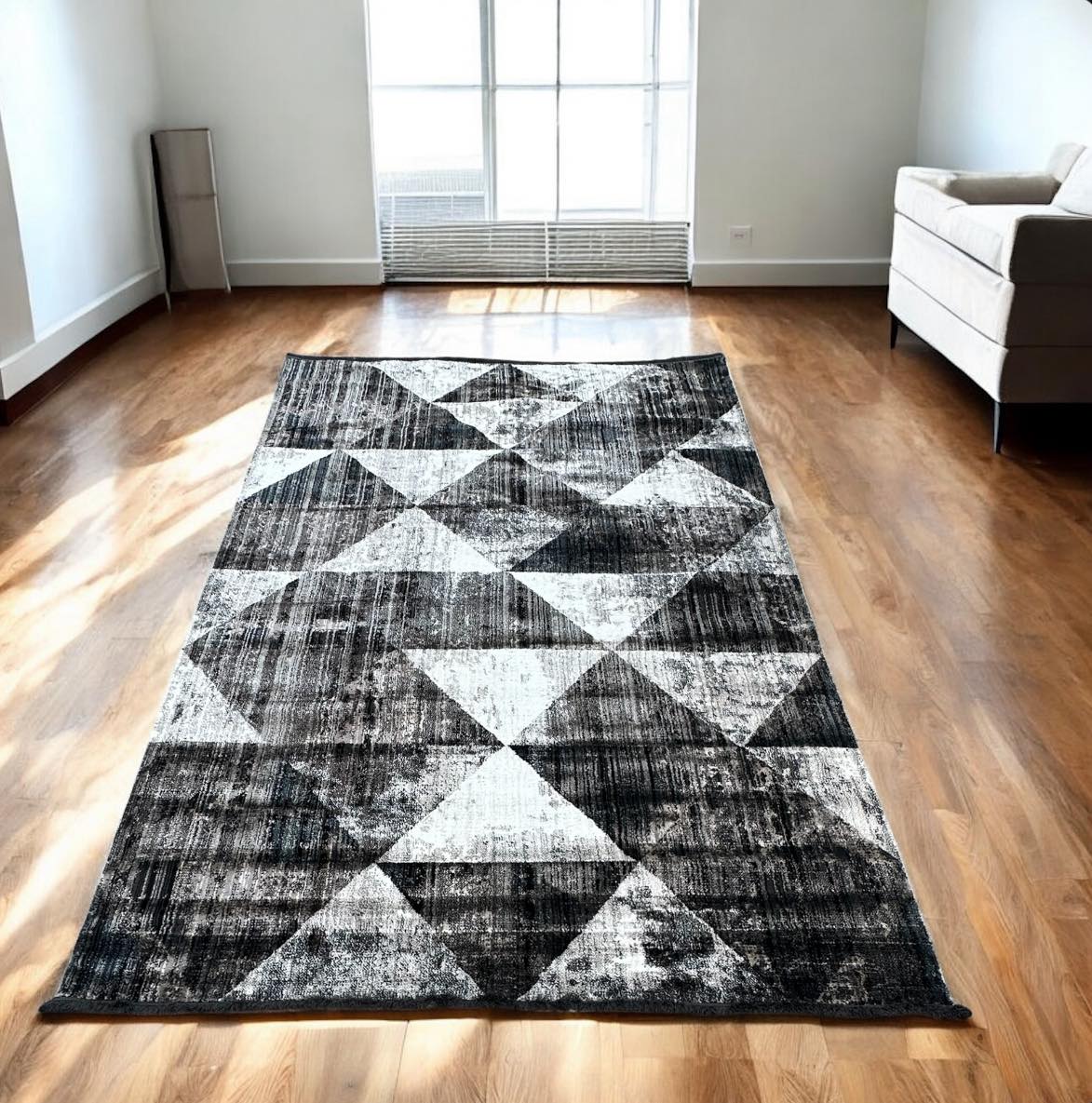 Δημιουργήστε έναν χώρο με στυλ και χαρακτήρα με αυτό το εντυπωσιακό χαλί σε διάσταση 200×290 cm. Ο συνδυασμός γεωμετρικού τριγωνικού σχεδίου σε τόνους μαύρου, γκρι και λευκού προσφέρει μίνιμαλ αλλά και δυναμική αισθητική, ιδανική για μοντέρνα ή industrial διακόσμηση.