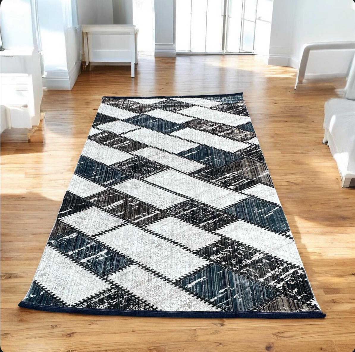 Ανανεώστε τον χώρο σας με αυτό το κομψό ανάγλυφο χαλί σε διάσταση 200×290 cm. Το μοντέρνο γεωμετρικό σχέδιο σε αποχρώσεις λευκού, γκρι, μαύρου και μπλε συνδυάζεται ιδανικά με τα διακριτικά κρόσσια, χαρίζοντας στο χαλί μια αίσθηση πολυτέλειας και ζεστασιάς.