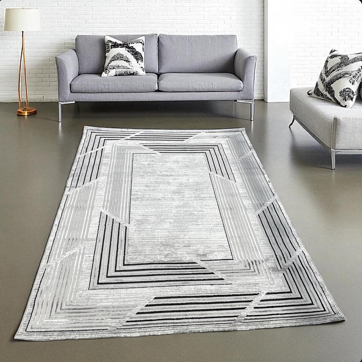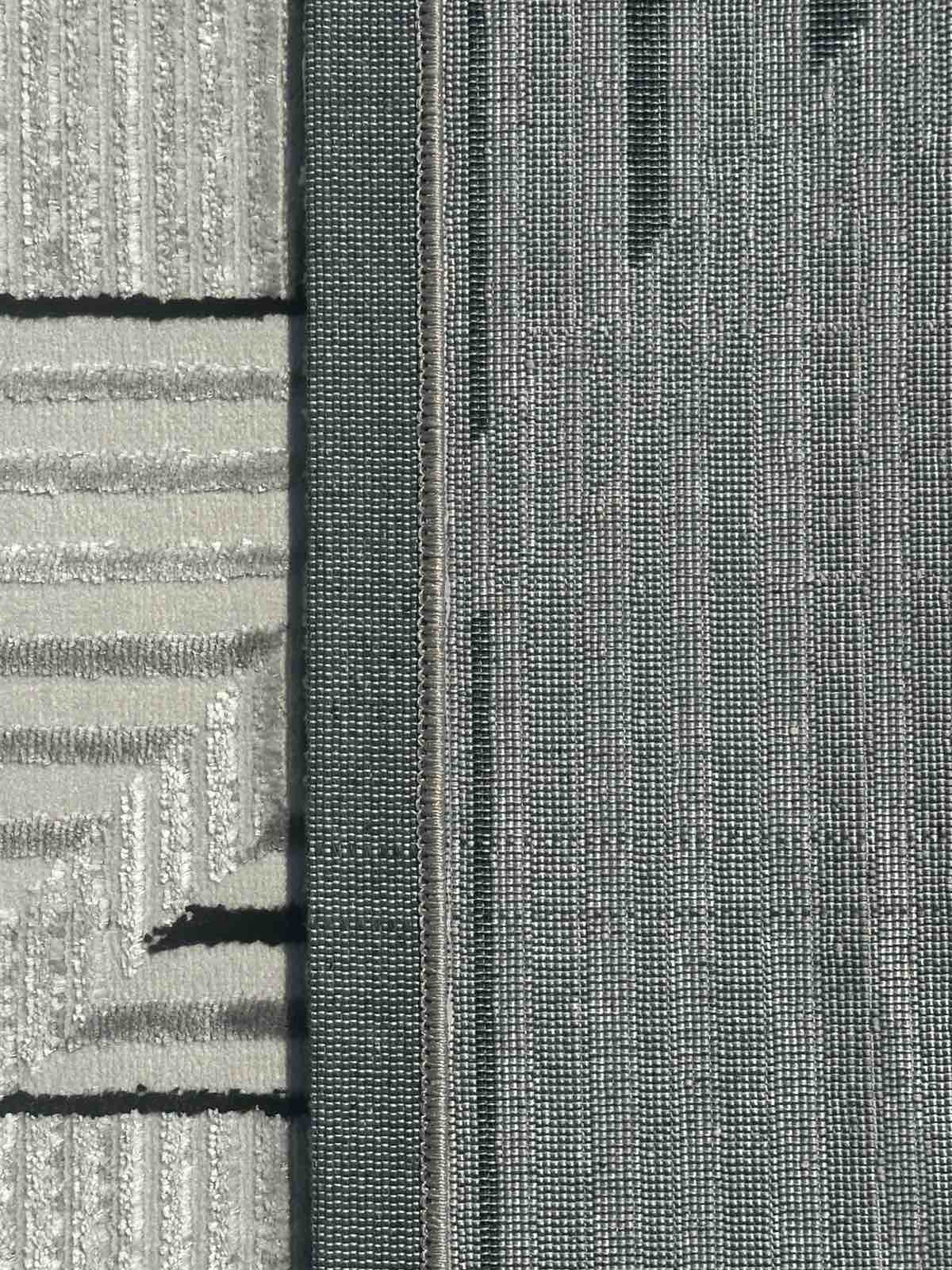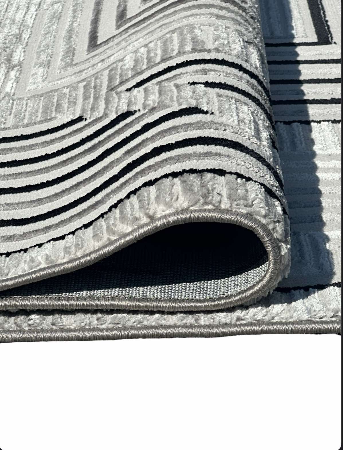 Μοντέρνο χαλί με εντυπωσιακό γεωμετρικό σχέδιο σε αποχρώσεις γκρι και μαύρου, που χαρίζουν δυναμισμό και κομψότητα στον χώρο. Η ανάγλυφη υφή του αναδεικνύει το μοτίβο και προσδίδει πολυτέλεια, ενώ η κατασκευή του από ποιοτικές ίνες εξασφαλίζει ότι δεν κρατάει τρίχες και δεν λερώνει εύκολα. Ιδανικό για σαλόνι, τραπεζαρία ή γραφείο, συνδυάζει πρακτικότητα και στυλ.