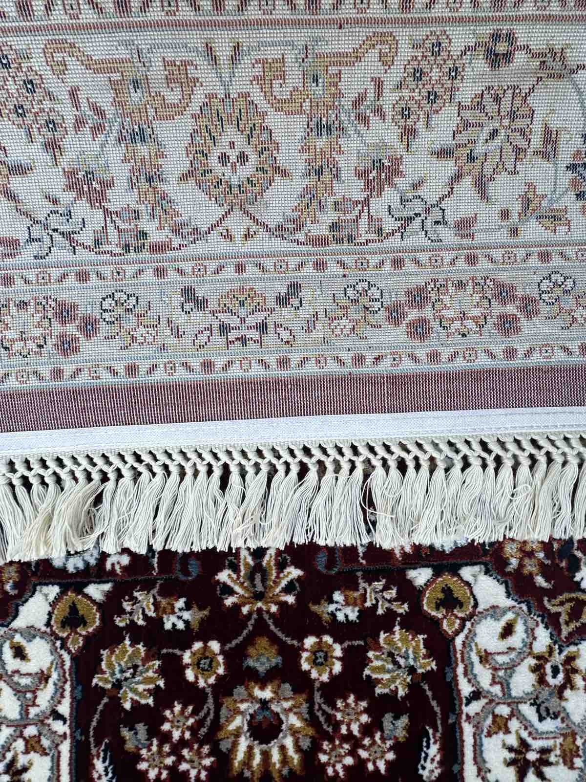 Το κύριο χρώμα του χαλιού είναι μπορντό, το οποίο δένει αρμονικά με αποχρώσεις εκρού, μπεζ, καφέ, ιβουάρ και μαύρου, δημιουργώντας ένα κομψό και περίτεχνο σχέδιο που ταιριάζει τόσο σε κλασικούς όσο και σε πιο μοντέρνους χώρους. Ολοκληρώνεται με κομψά κρόσσια στο τελείωμα, που ενισχύουν τον παραδοσιακό του χαρακτήρα.
