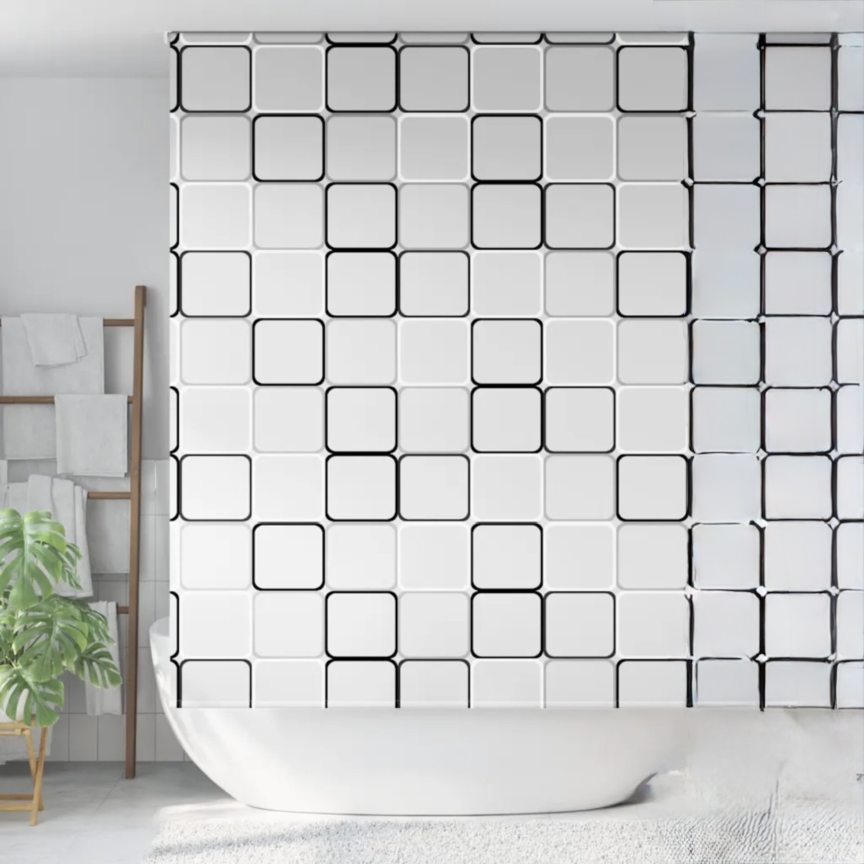 Ανανεώστε εύκολα την αισθητική του μπάνιου σας με αυτή την κομψή κουρτίνα μπάνιου από 100% πολυεστέρα. Με μοντέρνο γεωμετρικό μοτίβο σε λευκό φόντο και μαύρες λεπτομέρειες, προσφέρει στυλ και λειτουργικότητα, προστατεύοντας το χώρο από πιτσιλιές νερού.