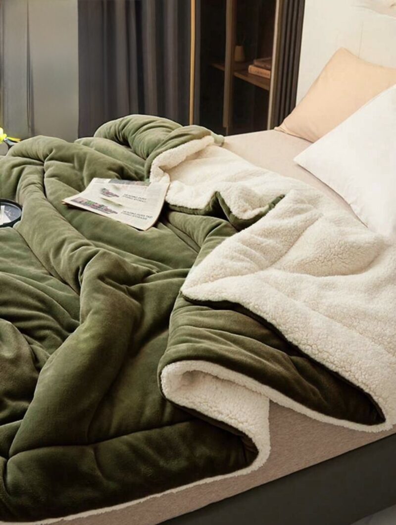 Η εξωτερική πλευρά από απαλό βελούδο σε κομψή λαδί απόχρωση χαρίζει μοναδικό στυλ στο υπνοδωμάτιο, ενώ το εσωτερικό με παχιά λευκή γούνα sherpa εξασφαλίζει απόλυτη θαλπωρή ακόμα και τις πιο παγωμένες νύχτες.