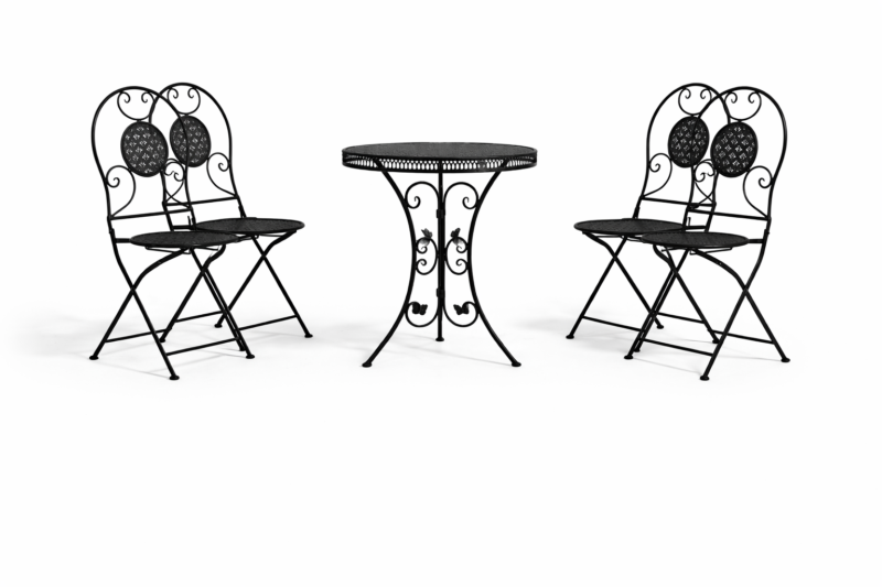 Το σετ αποτελείται από 4 κομψές πτυσσόμενες καρέκλες και 1 στρογγυλό τραπέζι, όλα κατασκευασμένα από ανθεκτικό μέταλλο υψηλής ποιότητας. Ο καλαίσθητος σχεδιασμός με διακοσμητικές λεπτομέρειες προσδίδει μια ρομαντική και elegant αισθητική που αναβαθμίζει κάθε εξωτερικό χώρο.