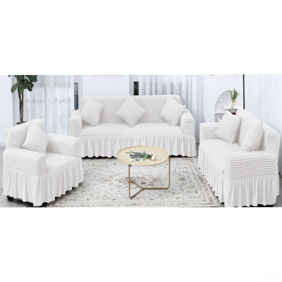 Το σετ περιλαμβάνει καλύμματα για έναν τριθέσιο καναπέ, έναν διθέσιο και μία πολυθρόνα, προσφέροντας ολοκληρωμένη κάλυψη και ομοιόμορφο αποτέλεσμα στον χώρο σας. Το διαχρονικό λευκό χρώμα χαρίζει φωτεινότητα και καθαρότητα, ταιριάζοντας εύκολα με κάθε στυλ διακόσμησης.