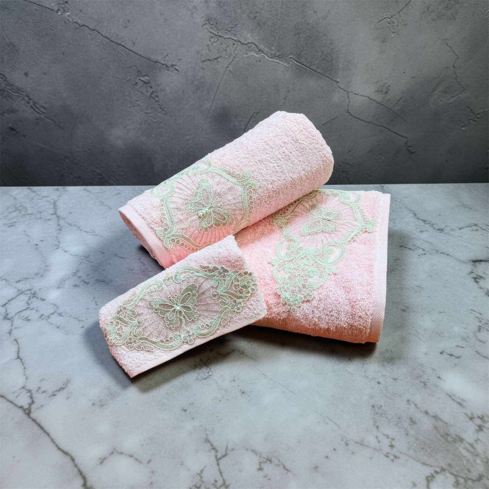 Ένα ρομαντικό και ιδιαίτερα κομψό σετ πετσετών σε απαλό ροζ χρώμα, που χαρίζει ζεστασιά και φινέτσα στο μπάνιο σας.