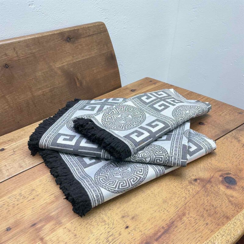 Ανανεώστε το σαλόνι σας με το κομψό σετ ριχταριών σε γκρι και μαύρο χρώμα, διακοσμημένο με μοντέρνο γεωμετρικό σχέδιο και ελληνικό μαίανδρο. Το σετ προσφέρει στυλ και προστασία στους καναπέδες και την πολυθρόνα σας, ενώ τα μαύρα κρόσσια στο τελείωμα προσθέτουν μια ιδιαίτερη διακοσμητική πινελιά.