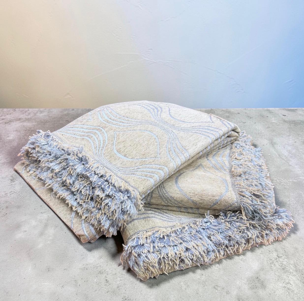 Ανανεώστε το σαλόνι σας με ένα κομψό σετ ριχταριών σε μοντέρνο συνδυασμό μπλε και μπεζ αποχρώσεων, με ιδιαίτερο υφαντό σχέδιο και διακοσμητικά κρόσια στις άκρες. Ο συνδυασμός των χρωμάτων προσφέρει μία κομψή και διαχρονική αισθητική που ταιριάζει εύκολα σε κάθε χώρο.